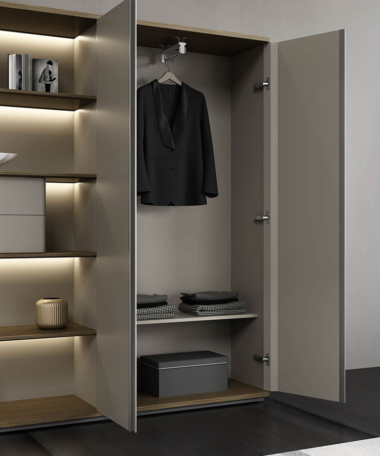 双门衣柜,同色型材拉手,内置抽拉式挂衣杆,一切只为优雅而生。Double-door Wardrobe with same-colored handle and built-in movable cloth hanger, everything just for elegance.