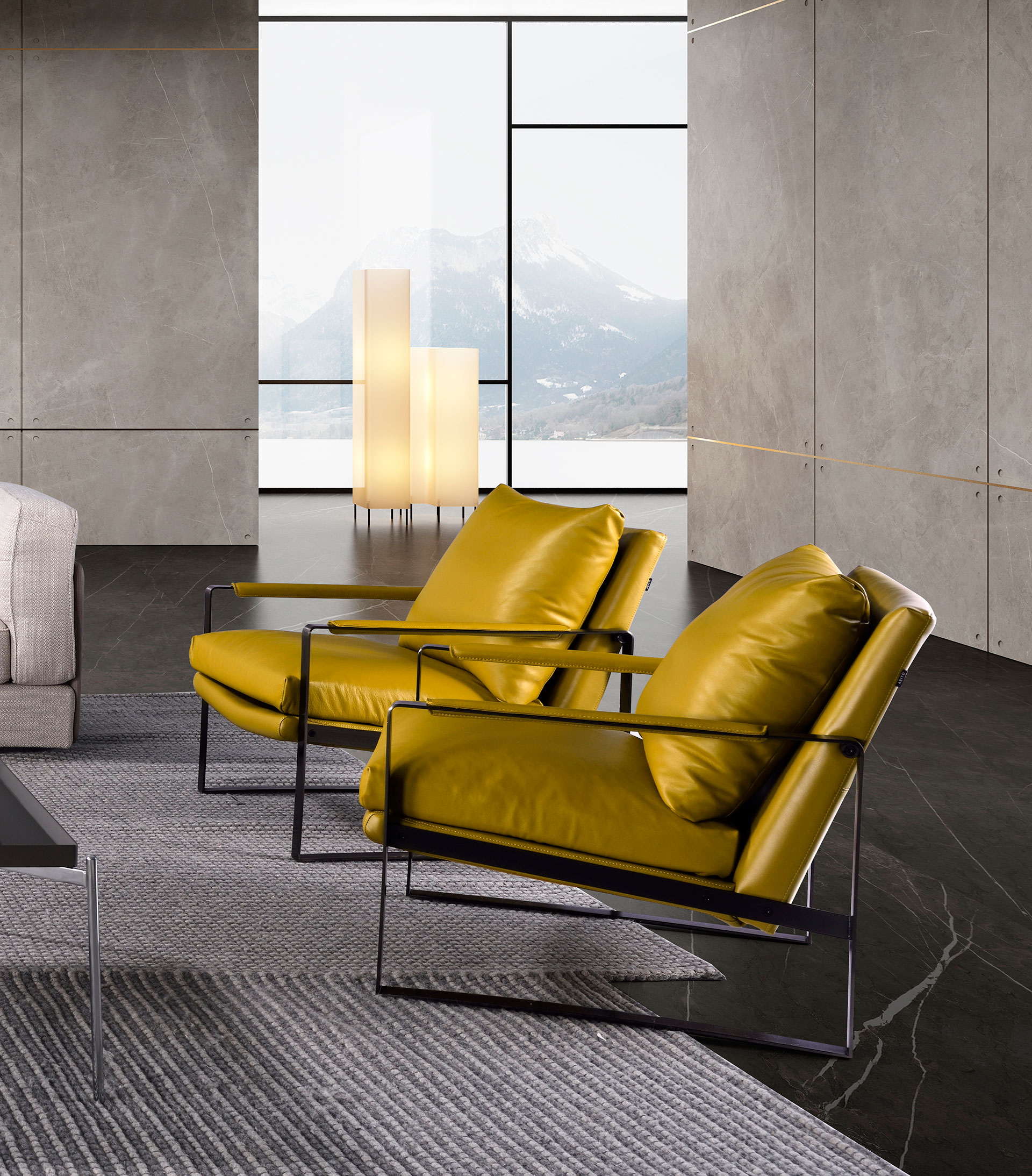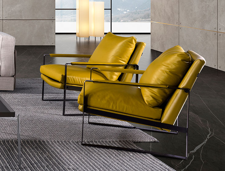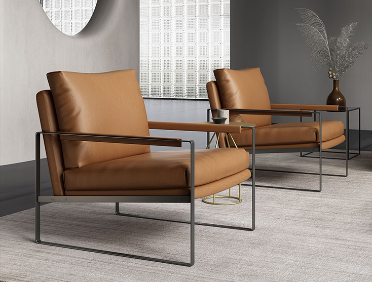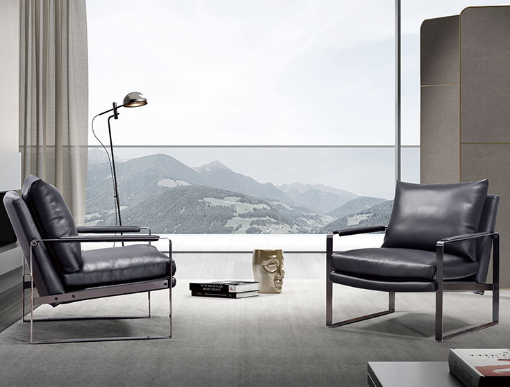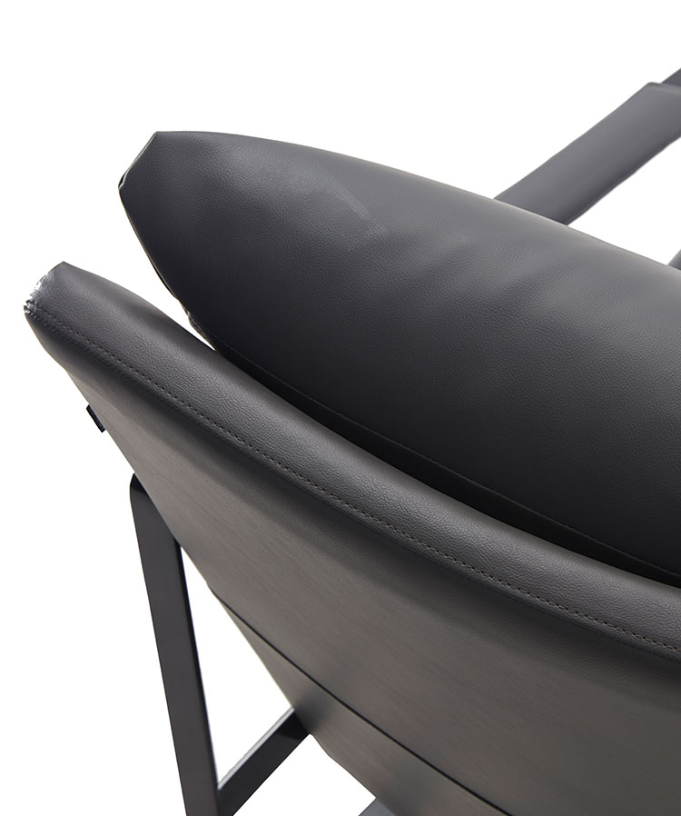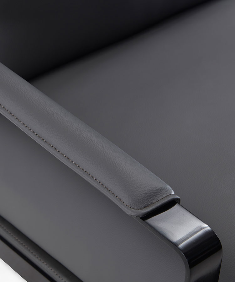 极佳的触感反馈:柔软的皮质软包包裹纤细的金属扶手,避免手肘接触金属的冰凉感,取而代之的是细腻柔软的抚摸质感。Soft leather wrapped metal armrests to avoid the elbow contact metal have cold touch, and replaced by a soft touch feeling.