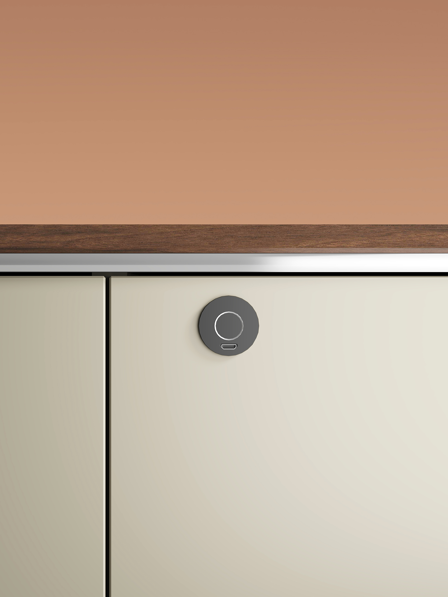 指纹密码锁使得储物更加安全便捷,为产品增添科技感与时尚感。The fingerprint lock ensures secure and convenient storage, adding asense of technology and fashion to the product.